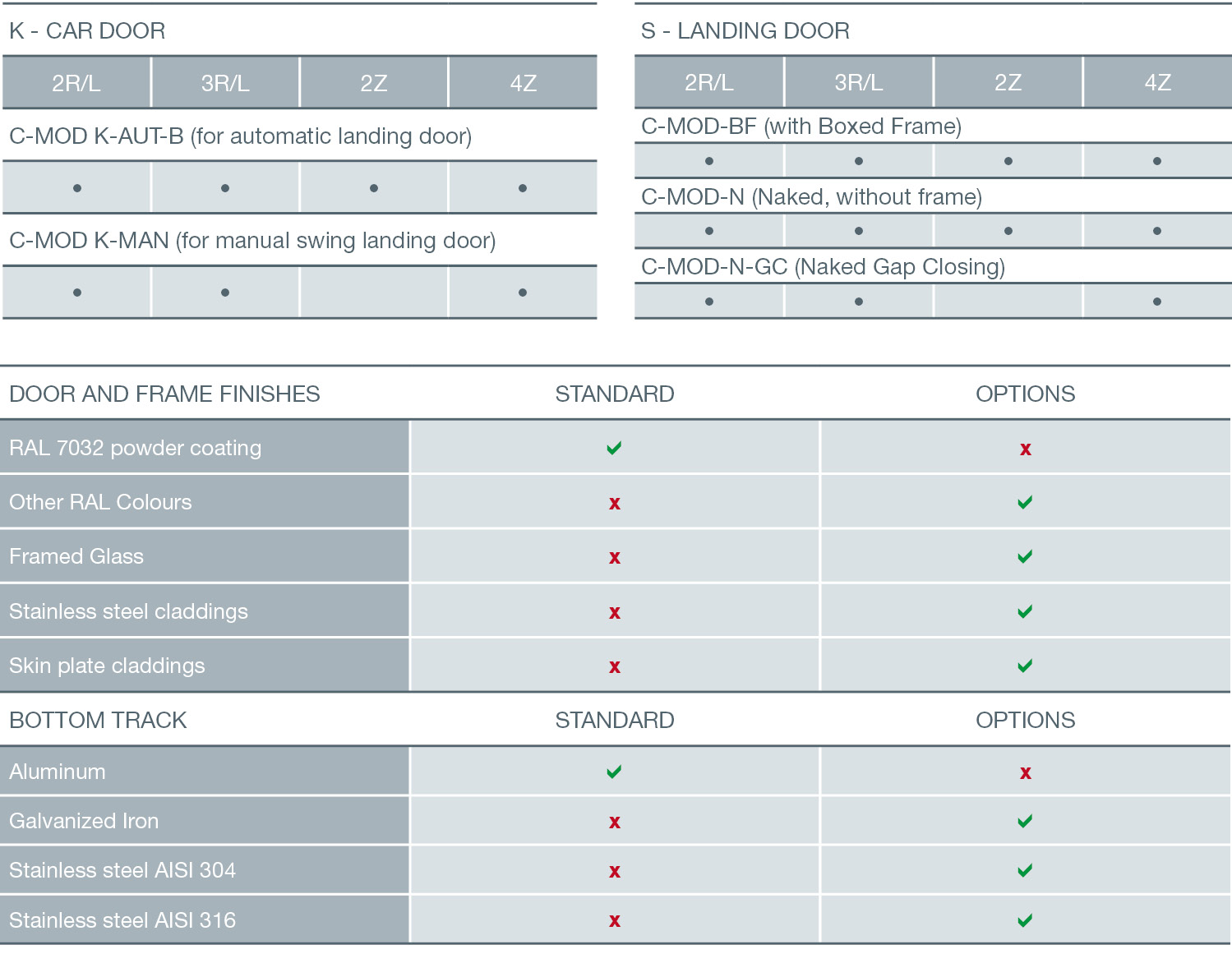 Con una amplia gama de opciones, las puertas 2000 C-MOD pueden ir con o sin marcos, ofreciendo una total flexibilidad para responder a las necesidades de cada instalación. Las puertas de cabina pueden accionar puertas de piso automáticas o semiautomáticas en aquellos casos donde sólo se necesite modernizar la puerta de cabina. Se pueden equipar en ambos casos con el regulador Sematic Drive System (SDS) para obtener un mayor control y las más altas prestaciones o bien con el regulador SZS para soluciones más económicas.